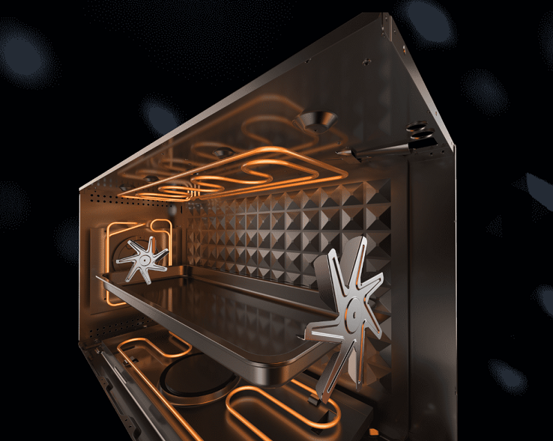 另一方面,凱度第一次將其行業(yè)首創(chuàng)的雙熱風(fēng)技術(shù)植入到集成灶中,全新凱度蒸烤集成中心的蒸烤組件通過將背部的離心風(fēng)機(jī)從一個(gè)升級(jí)為兩個(gè),并且分別以順時(shí)針、逆時(shí)針雙向旋轉(zhuǎn),再搭配背板的黃金熱風(fēng)孔、專業(yè)四組烤管等,形成一套完善均衡的全驅(qū)熱力系統(tǒng),有效克服了市面上其他蒸烤類集成灶控溫不準(zhǔn)、溫場(chǎng)不勻、熱力不足的使用痛點(diǎn)。當(dāng)啟動(dòng)程序后,全新凱度蒸烤集成中心中的蒸烤一體機(jī)將會(huì)迅速形成能量極高、對(duì)流強(qiáng)勁的熱風(fēng),在內(nèi)腔中充分的涌動(dòng)起來,并能有效地觸及內(nèi)腔的各個(gè)角落,使得腔內(nèi)各點(diǎn)的溫度達(dá)到前所未有的均勻,食材能夠360℃均勻受熱,進(jìn)而創(chuàng)造更高效、零失敗的完美體驗(yàn)。