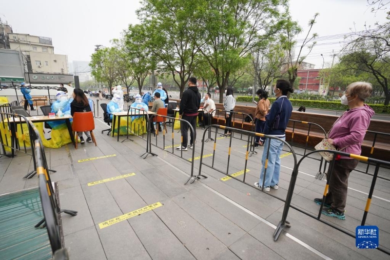 4月25日,在北京市朝陽區(qū)八里莊街道一處核酸采樣點,市民在排隊等候進行核酸采樣。