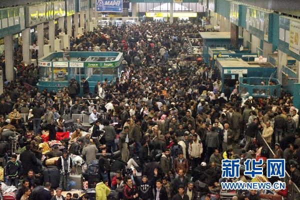 等待撤離的各國公民擠滿了利比亞首都的黎波里機(jī)場(chǎng)候機(jī)大廳。 新華社