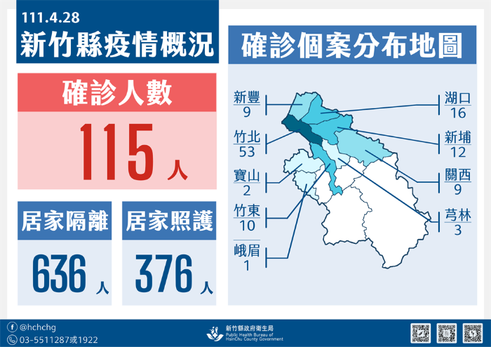 115例的地區(qū)分布為竹北市53例、竹東鎮(zhèn)10例、湖口鄉(xiāng)16例、新豐鄉(xiāng)9例、新埔鎮(zhèn)12例、關(guān)西鎮(zhèn)9例、芎林鄉(xiāng)3例、峨眉鄉(xiāng)1例、寶山2例,分別安排就醫(yī)住院、集中檢疫場所治療及申請居家照護(hù)方案。