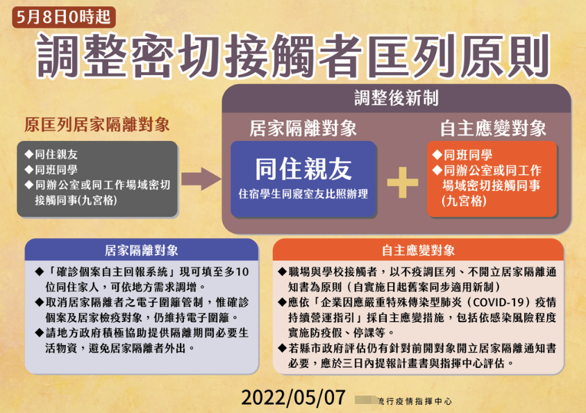 臺“流行疫情指揮中心”今宣布,鑒于近期本地疫情急遽升溫,為強化防疫量能及韌性,5月8日起密切接觸者匡列以同住親友為原則,職場、學(xué)校則采自主應(yīng)變。確診者于隔離治療、居家照護及居家檢疫期間,仍維持電子圍籬措施,但取消居家隔離者電子圍籬措施。