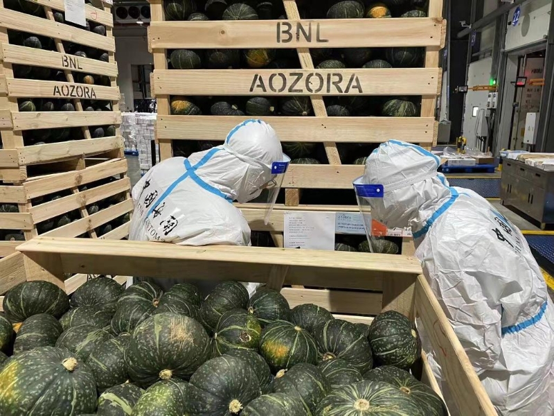 3月29日,一批進(jìn)口南瓜在上??诎督邮軝z疫查驗(yàn)。(新華社發(fā) 上海海關(guān)供圖)