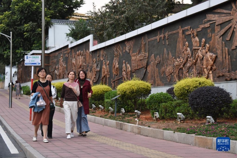 行人走過(guò)福建省三明市三鋼集團(tuán)浮雕墻(2020年11月17日攝)。