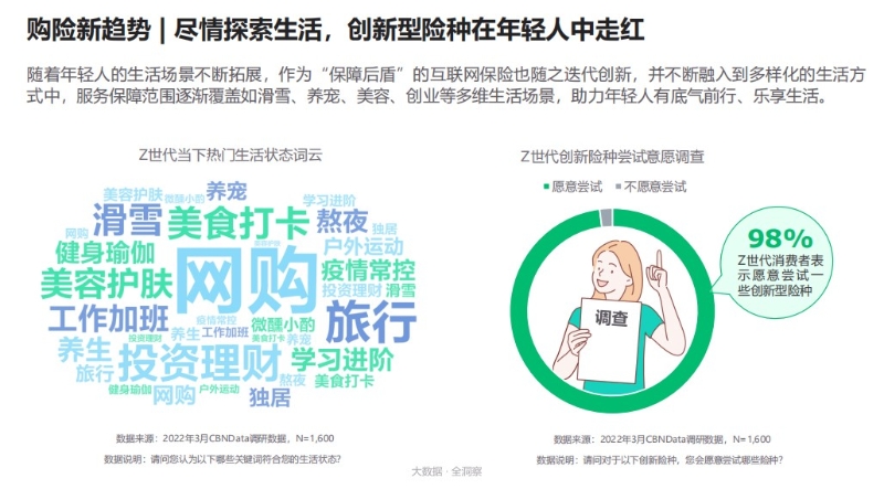 顯然,與又喪又佛的80、90后相比,Z世代可謂是“宅浪雙全”,靜可宅在家刷劇、聽歌、擼貓,動(dòng)可出門滑雪、沖浪、看大好河山。當(dāng)然,活得盡興,更要活得健康。面對(duì)年輕人消費(fèi)需求的日益多元,眾安保險(xiǎn)等互聯(lián)網(wǎng)險(xiǎn)企利用保險(xiǎn)科技賦能業(yè)務(wù),探索數(shù)字生活新場(chǎng)景,一些創(chuàng)新型險(xiǎn)種在年輕人中走紅,并不斷融入到多樣化的生活方式中,服務(wù)保障范圍逐漸覆蓋如滑雪、養(yǎng)寵等多維生活場(chǎng)景。