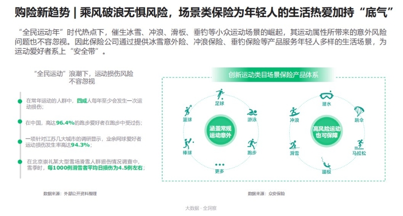 與此同時(shí),在“全民運(yùn)動(dòng)年”的時(shí)代熱點(diǎn)及冰雪、沖浪等小眾運(yùn)動(dòng)場(chǎng)景崛起之下,互聯(lián)網(wǎng)險(xiǎn)企試圖通過提供冰雪意外險(xiǎn)、沖浪保險(xiǎn)、垂釣保險(xiǎn)等產(chǎn)品,為運(yùn)動(dòng)愛好者系上“安全帶”。比如,眾安保險(xiǎn)的運(yùn)動(dòng)意外險(xiǎn)創(chuàng)新運(yùn)動(dòng)類目場(chǎng)景保險(xiǎn)產(chǎn)品體系,不僅涵蓋游泳、跑步等常規(guī)運(yùn)動(dòng)意外,滑雪、跳傘等高風(fēng)險(xiǎn)運(yùn)動(dòng)也可保障,為年輕人的生活熱愛加持“底氣”。