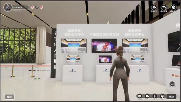 通過運(yùn)用數(shù)字孿生技術(shù),大會以天府國際會議中心的"成都廳"為原型,在元宇宙展會再現(xiàn)一個(gè)"成都廳",為參展商和觀眾提供身臨其境的線上會展場景。參展商和觀眾通過登錄軟件,輸入ID即可進(jìn)入元宇宙展會現(xiàn)場。參會者可根據(jù)喜好選擇數(shù)字人形象,體驗(yàn)參會、看展、交流互動等環(huán)節(jié)。
