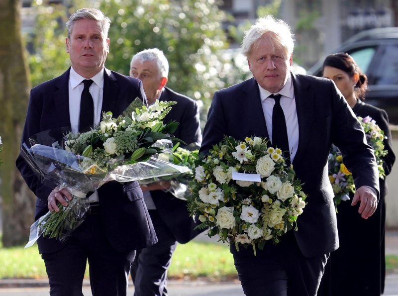 2021年10月16日,英國首相、保守黨領袖鮑里斯·約翰遜(前右)、工黨領袖斯塔默(前左)來到英國埃塞克斯郡濱海利獻花,悼念遇刺身亡的英國保守黨議員戴維·阿梅斯。新華社發(fā)(英國首相府供圖)