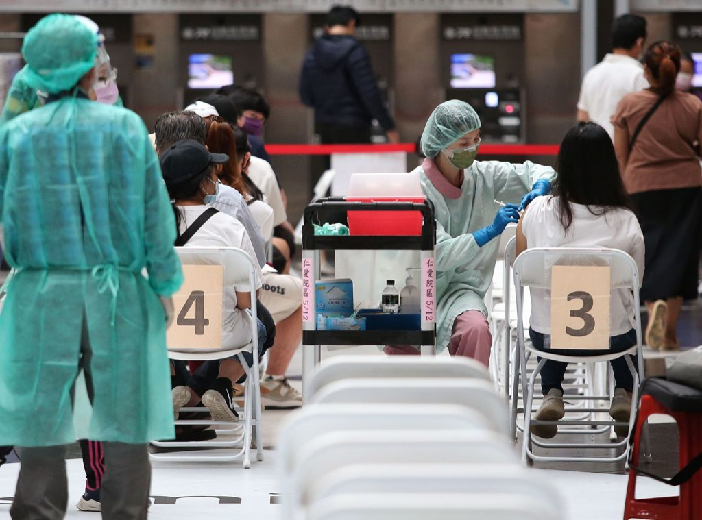 新冠疫情升溫,10日確診人數(shù)新增超過5萬人。圖為臺北車站疫苗接種站,民眾接種疫苗增加自身防護(hù)力。(資料照/王英豪攝)
