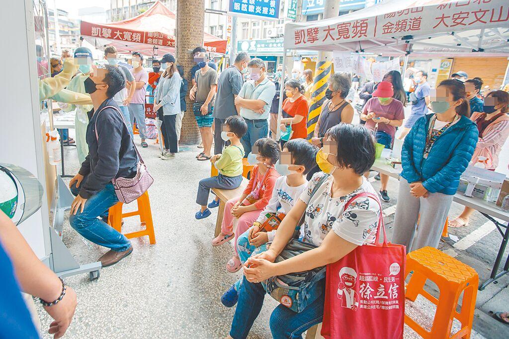 臺衛(wèi)福部門主管陳時中號稱PCR每天檢驗量能可達22萬件,但臺北市議員徐巧芯打臉,最高1天只有8萬件。圖為北市一家耳鼻喉科診所外,民眾攜家?guī)Ь烨巴鵓CR篩檢。(郭吉銓攝)
