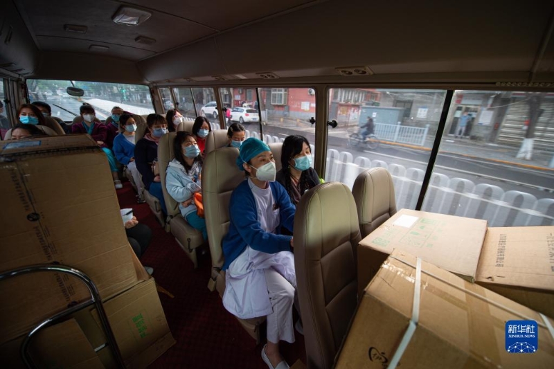 5月11日清晨,客車搭載著來自不同醫(yī)院的核酸采樣人員和物資駛向采樣點。
