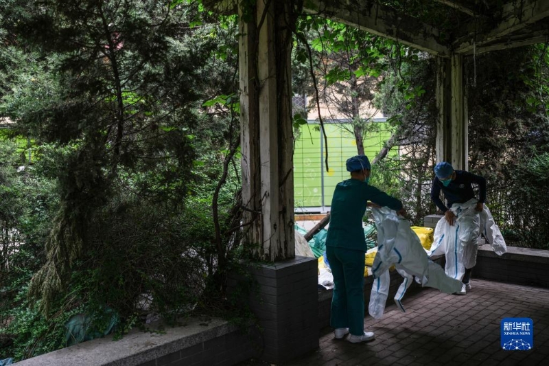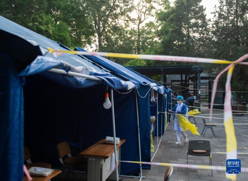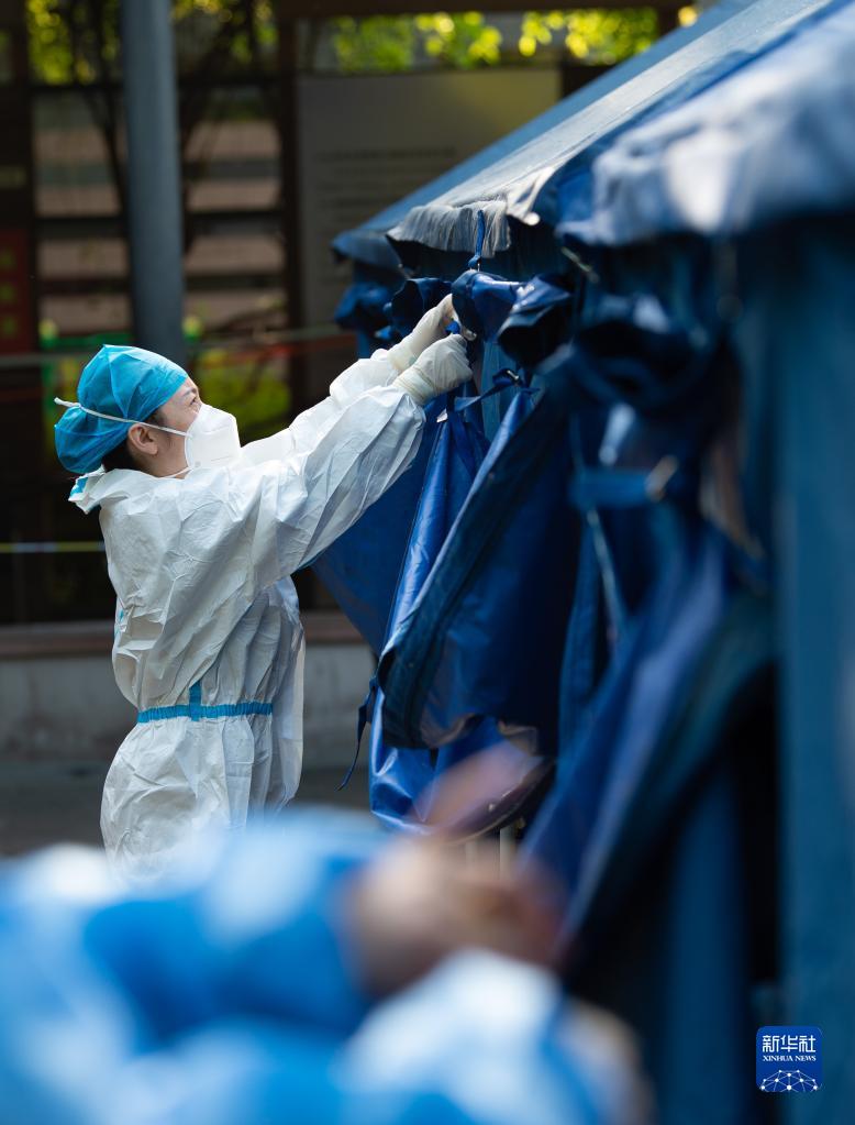5月11日,在東城區(qū)南館公園采樣點,北京市第六醫(yī)院呼吸科護(hù)士長王楊在整理采樣所用的帳篷。