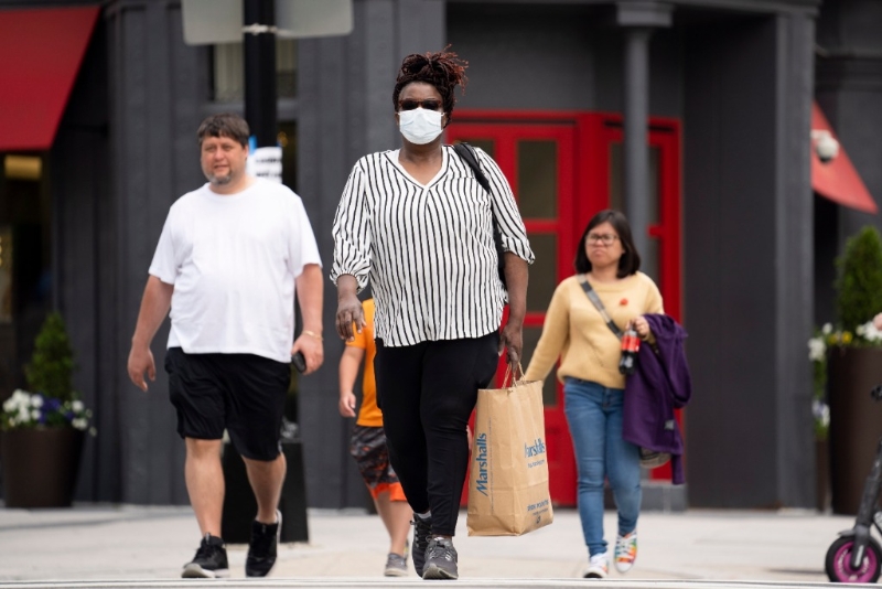 5月11日,在美國(guó)首都華盛頓,一名行人提著購(gòu)物袋走過(guò)街頭。新華社記者劉杰攝