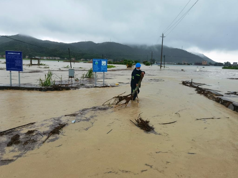 12日,臺山長海橋水位超出公路,防汛干部清理雜物。(受訪者供圖)