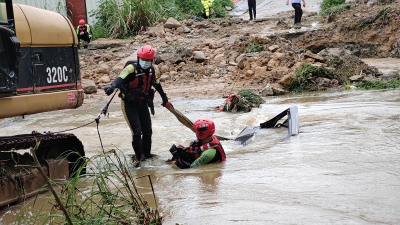 消防救援人員營救洪水中的被困人員。(受訪者供圖)
