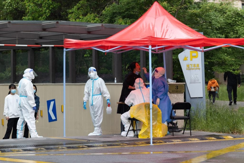 5月11日,上海市浦東新區(qū)北蔡鎮(zhèn)乾景雅園小區(qū),居民做核酸采樣。(新華社記者金立旺 攝)