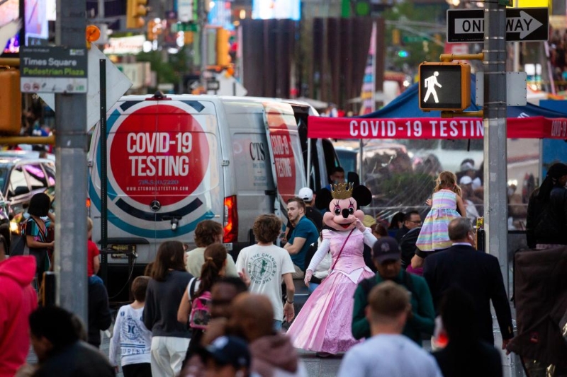 5月12日,在美國(guó)紐約時(shí)報(bào)廣場(chǎng),人們從一個(gè)新冠檢測(cè)點(diǎn)旁經(jīng)過(guò)。新華社發(fā)(郭克攝)