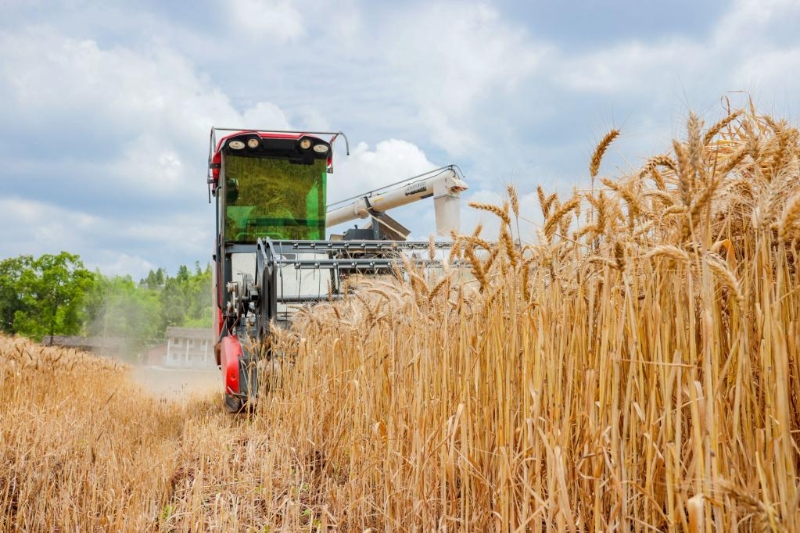 2022年5月16日,收割機(jī)在四川遂寧射洪市仁和鎮(zhèn)中房村酒糧基地收割小麥。新華社發(fā)(劉昌松 攝)