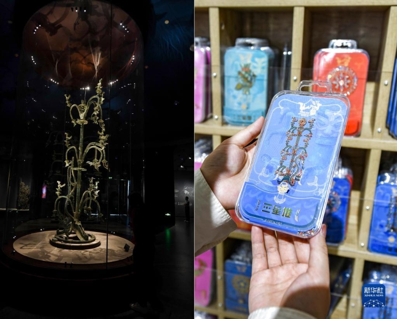 拼版照片:左圖是在三星堆博物館拍攝的青銅神樹;右圖是在三星堆博物館文創(chuàng)商店拍攝的青銅神樹書簽(5月16日攝)。