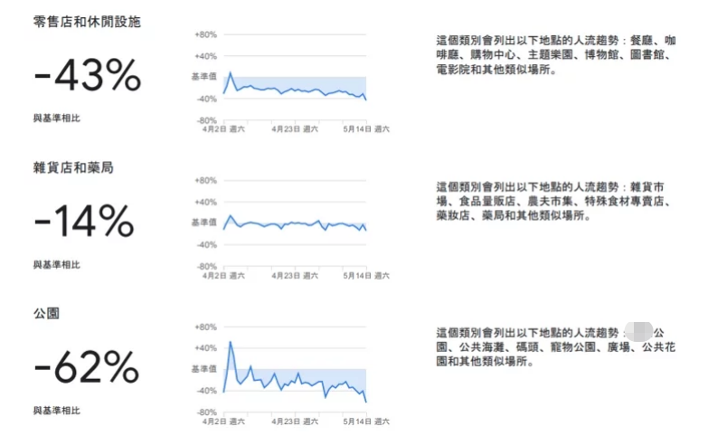 根據(jù)Google更新到5月14日的“COVID-19社區(qū)人流趨勢報(bào)告”: