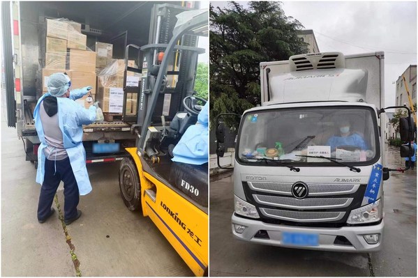 富士膠片(中國)向上海市老年基金會“抗疫守滬·關(guān)愛老人”公益項(xiàng)目捐贈的富士銀離子消毒抗菌產(chǎn)品裝車發(fā)貨