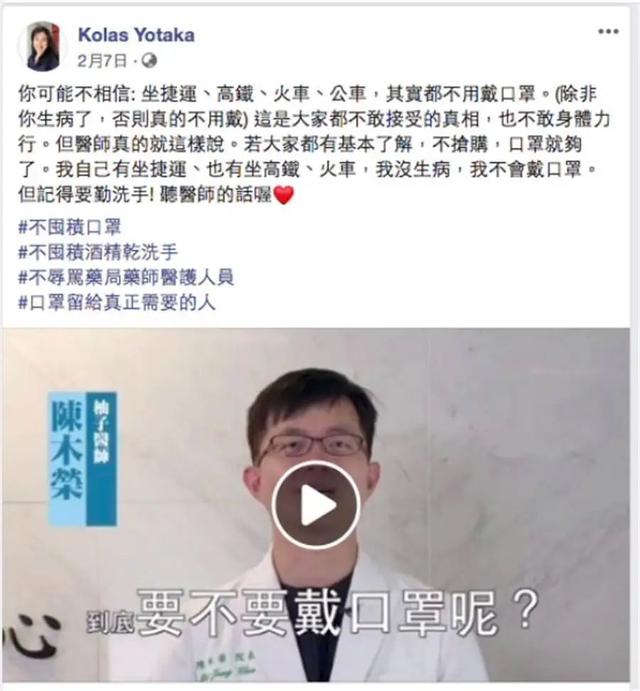 可是到了2月1日,臺(tái)行政機(jī)構(gòu)發(fā)言人谷辣斯卻開始倡導(dǎo)“健康民眾不必戴口罩”;2月7日谷辣斯又開始強(qiáng)調(diào)連捷運(yùn)、高鐵、火車、公交車這種密閉空間都不必戴口罩,“除非你生病了”。