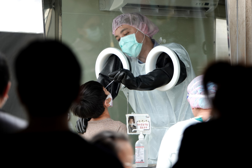 篩檢站涌入許多等候篩檢的民眾,醫(yī)護人員身穿全套隔離裝,在采檢亭內(nèi)作業(yè)。(黃世麒攝)
