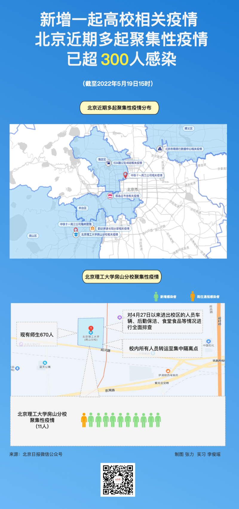 5月19日發(fā)布會上,北京通報新增一起高校聚集性疫情——北京理工大學(xué)房山分校已累計11人確診。5月18日15時至19日15時,49例與近期發(fā)生的聚集性疫情有關(guān)。