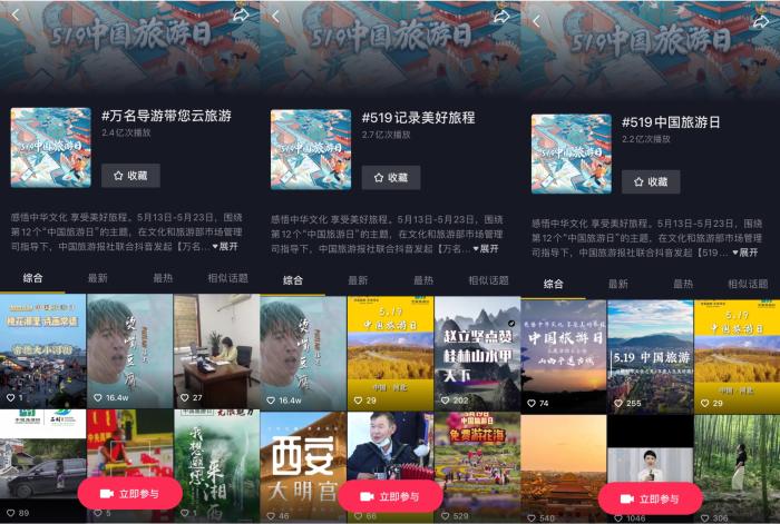 受新冠疫情影響,各地旅客出游減少。為激發(fā)更廣泛的“云游”意愿,積蓄旅游復蘇力量,5月13日抖音上線#519中國旅游日、#萬名導游帶您云旅游、#519記錄美好旅程系列話題活動,目前已有超7.3億次播放。5月13日至5月23日,各地文化和旅游部門、旅游景區(qū)、導游、旅行達人也通過直播、視頻等形式,帶領(lǐng)全國游客“云游”。