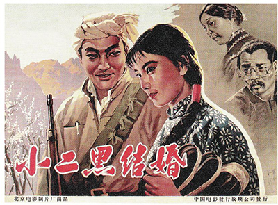 在延安文藝座談會(huì)的影響下,作家趙樹理于1943年創(chuàng)作完成短篇小說(shuō)《小二黑結(jié)婚》。1964年,由北京電影制片廠根據(jù)該小說(shuō)改編的同名電影上映,以電影的形式重溫了抗戰(zhàn)時(shí)期青年小二黑和小芹為追求婚姻自由,在黨的關(guān)懷下沖破封建家長(zhǎng)阻撓、結(jié)為夫婦的故事。電影《小二黑結(jié)婚》海報(bào)由著名軍旅畫家江平先生繪就。海報(bào)承襲了原著及影片活潑、清新的格調(diào),富有質(zhì)樸、濃郁的山西鄉(xiāng)土氣息,凸顯出解放區(qū)進(jìn)步青年的形象。