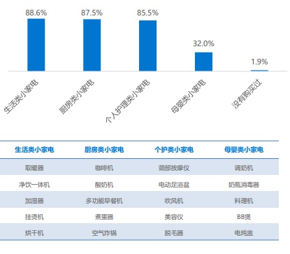 36氪研究院數(shù)據(jù)顯示,所有受訪者中完全沒有購買過任何小家電產(chǎn)品的僅占1.9%,購買過生活類、廚具類、個人護理類小家電的年輕人達8成以上。年輕人購買小家電等泛家居產(chǎn)品已成為流行趨勢。