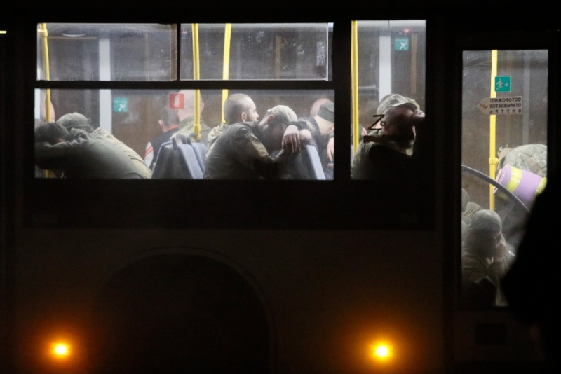 5月20日,載著烏克蘭武裝人員的巴士抵達(dá)俄軍控制的奧列尼夫卡鎮(zhèn)。新華社發(fā)(維克托攝)