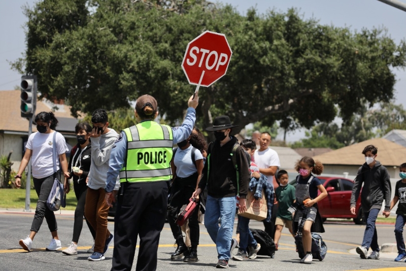 5月25日,一名警員在美國洛杉磯縣一所小學(xué)附近臨時(shí)指揮交通,為學(xué)生放學(xué)提供安全保護(hù)。新華社發(fā)