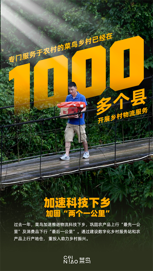 過(guò)去一年,菜鳥(niǎo)加速推進(jìn)物流科技下鄉(xiāng),鞏固農(nóng)產(chǎn)品上行“最先一公里”及消費(fèi)品下行“最后一公里”。