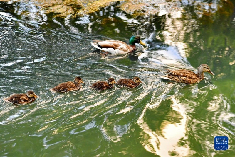 一對(duì)成年綠頭鴨帶著小鴨在拉魯濕地游動(dòng)(5月27日攝)。