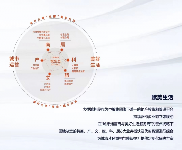 在該模式下,總資產(chǎn)約2000億元的大悅城控股,將商、產(chǎn)、文、旅、科、居六大業(yè)務(wù)板塊及優(yōu)勢(shì)資源進(jìn)行有機(jī)組合,構(gòu)建起了業(yè)態(tài)類型豐富、城市布局完善、資產(chǎn)結(jié)構(gòu)均衡、集人民美好生活場(chǎng)景于一體的“大悅”生態(tài)圈。