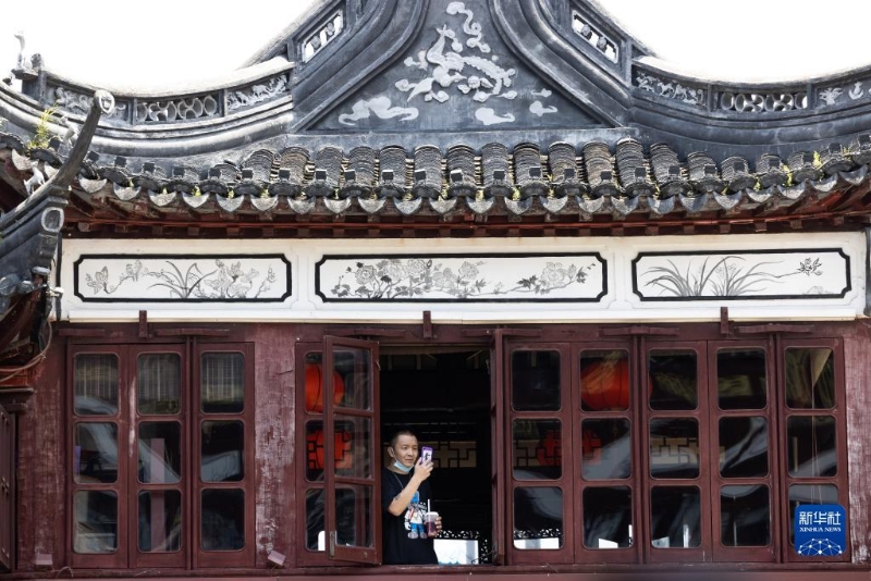 5月31日,在上海黃浦區(qū)豫園商城,市民在湖心亭茶樓上拍照。