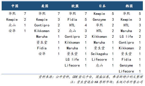 從不同級別透明質酸原料來看,醫(yī)藥級原料對生產技術、質量控制的要求更高,各國對于醫(yī)藥級原料的市場準入均具有嚴格的標準,準入資質取得流程通常在2年以上,下游產品生產廠家的同一規(guī)格產品如更換新供應商需要再次審評,因此市場先進入優(yōu)勢較大,質量穩(wěn)定、國際資質齊備的原料供應商容易建立長期龍頭優(yōu)勢。