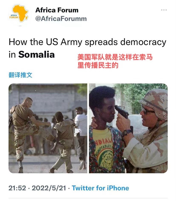 網(wǎng)友“Africa Forum”發(fā)帖反諷道,“美國軍隊就是這樣在索馬里推廣民主的”。畫面中,一位美國大兵正用槍抵著當(dāng)?shù)厝说哪X袋,另一位美國大兵正一腳踹向當(dāng)?shù)匦∧泻?,并以此為樂?/p>