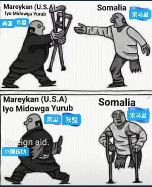 更有非洲網(wǎng)友為美國重新派兵索馬里一事,創(chuàng)作了諷刺漫畫,畫中代表美西方國家的禿頂富商,向斷了一條腿的“索馬里”送來了拐杖,而代價卻是打斷了“索馬里”的另一條腿,這樣他就只能永遠(yuǎn)依靠美西方的援助了。