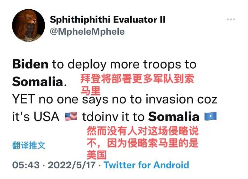 當(dāng)美國說它要給索馬里帶來“和平”和“安定”,非洲網(wǎng)友的耿直評論,道出了真相: