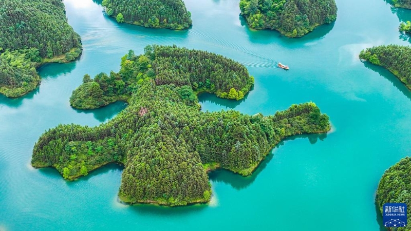 6月4日,志愿者在湖南省常寧市洋泉水庫清理水面漂浮物(無人機(jī)照片)。