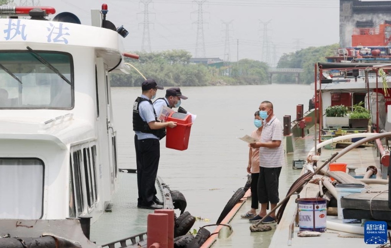 6月4日,浙江省湖州市德清縣運(yùn)河生態(tài)聯(lián)勤警務(wù)站民警向船員們講解船舶垃圾分類知識(shí)。