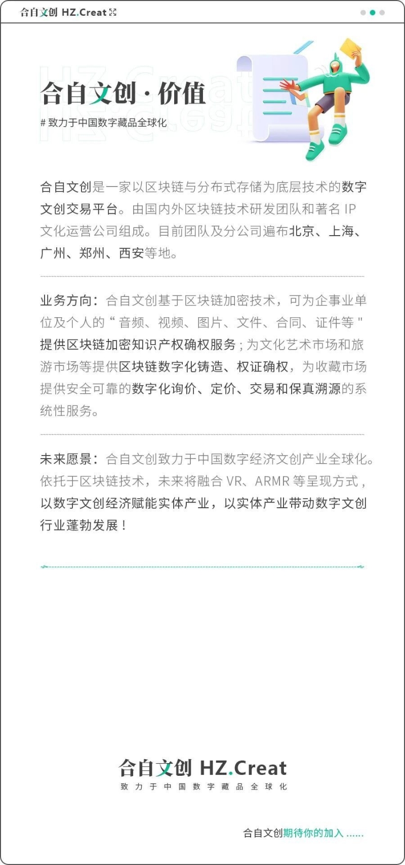 合自文創(chuàng)作為數(shù)字藝術品收藏領域的建設者,我們致力于將中國數(shù)字藝術藏品推向全球,同時打造數(shù)字藝術藏品權益與實體商業(yè)發(fā)展的良性生態(tài)閉環(huán)。