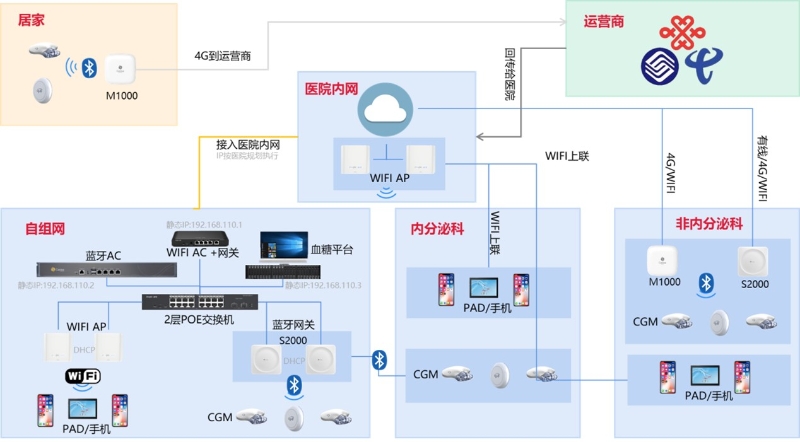 桂花網(wǎng)的解決方案是在內(nèi)分泌科室部署整套系統(tǒng),兼顧其它科室的需求,形成一套全院血糖管理系統(tǒng)。內(nèi)分泌科室整套系統(tǒng)包括血糖系統(tǒng)、藍(lán)牙/Wi-Fi網(wǎng)絡(luò)等,而婦科、兒科、胸外科等只需根據(jù)需求選擇特定網(wǎng)關(guān)(如S2000或M1000),即在需持續(xù)覆蓋的少量病房選擇S2000,在突發(fā)應(yīng)急病房選擇M1000,無需布線,使用充電寶/市電即可工作。