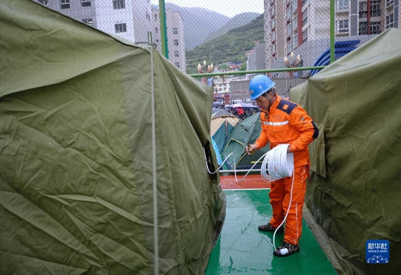 6月10日,在馬爾康市州醫(yī)院背后廣場安置點內,國家電網工作人員在鋪設電線。新華社記者 劉坤 攝