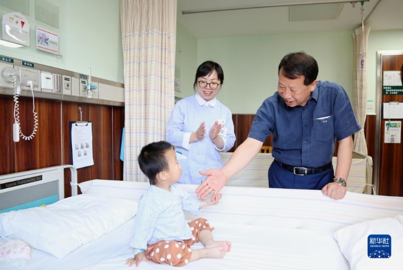 謝俊明(右一)在醫(yī)院里跟兒童患者互動(dòng)(2019年6月6日攝)。新華社發(fā)