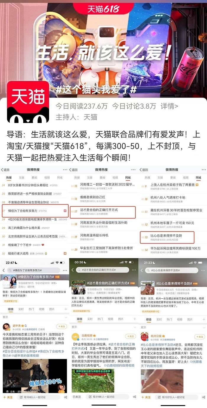 在#有愛(ài)才會(huì)合拍#的主話題下,天貓“蹭”上了王心凌愛(ài)你、畢業(yè)季云合拍、圣火喵喵教等微博熱點(diǎn),打造了#比心總是來(lái)得猝不及防#、#這才是合拍的正確打開(kāi)方式#、#被人類通用手勢(shì)拿捏了#等熱點(diǎn)話題,并延續(xù)話題熱度,推出#這個(gè)貓頭我愛(ài)了#進(jìn)行品牌矩陣聯(lián)合發(fā)聲。