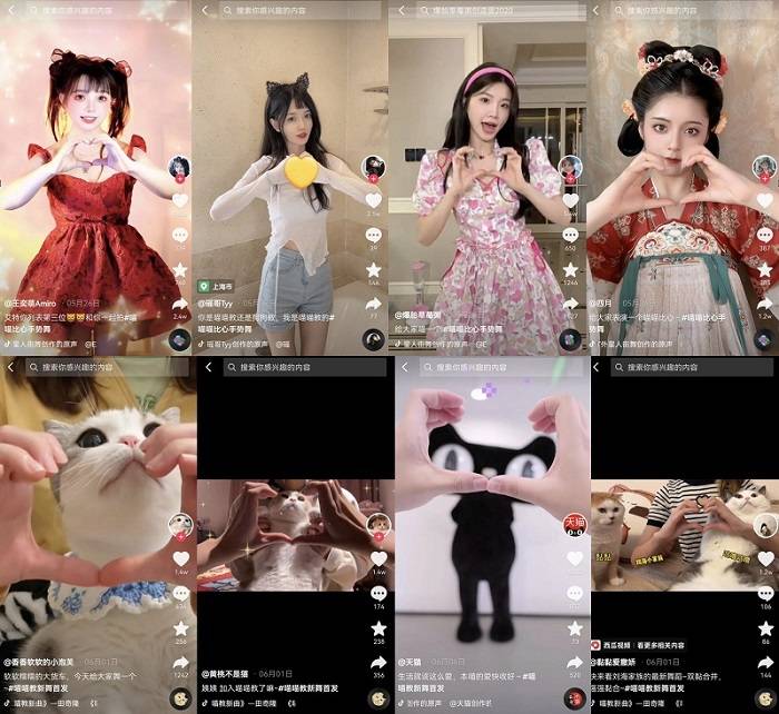 抖音上來(lái)自美妝、漢服、萌寵等各領(lǐng)域的達(dá)人們,本身就自帶了某種“熱愛(ài)標(biāo)簽”,而他們影響、帶動(dòng)的同圈層的粉絲。因此,這一輪抖音喵喵手勢(shì)舞熱潮,在開(kāi)發(fā)手勢(shì)新玩法的同時(shí),也成為了有著相同熱愛(ài)的人群展示熱愛(ài)的儀式。