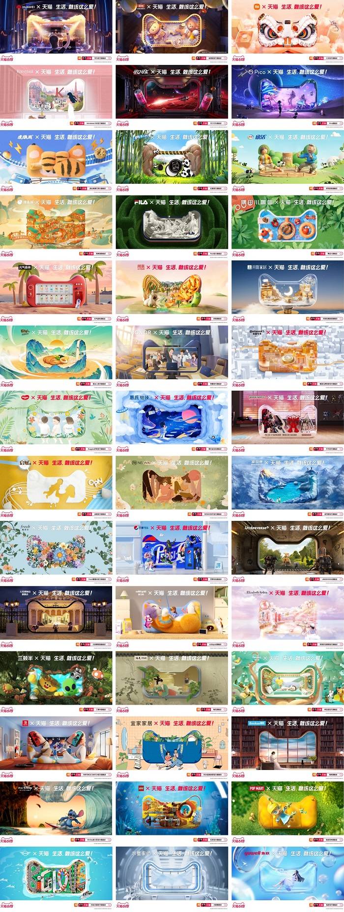 這些大牌貓頭創(chuàng)意中,不僅加入了特定的品牌生活方式場(chǎng)景,還與代表熱愛(ài)的愛(ài)心視覺(jué)元素巧妙結(jié)合,將“天貓緊密關(guān)聯(lián)生活熱愛(ài)”的概念以視覺(jué)形式延展、擴(kuò)散。