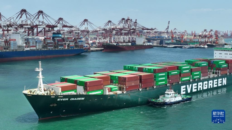 營(yíng)運(yùn)印巴航線的“索菲亞”號(hào)集裝箱貨輪在山東港口青島港裝卸集裝箱(6月15日攝,無人機(jī)照片)。 新華社記者 李紫恒 攝